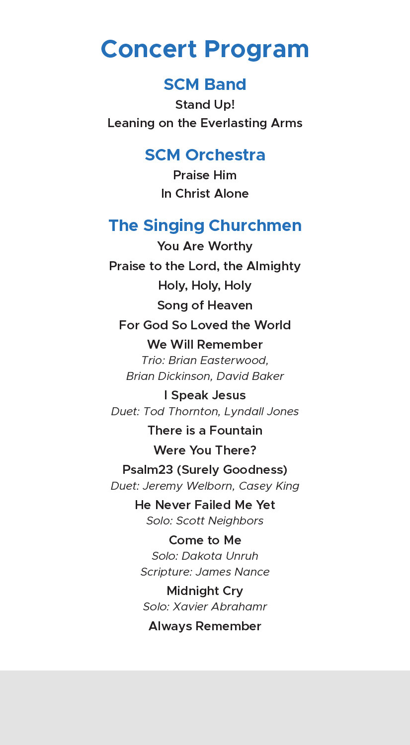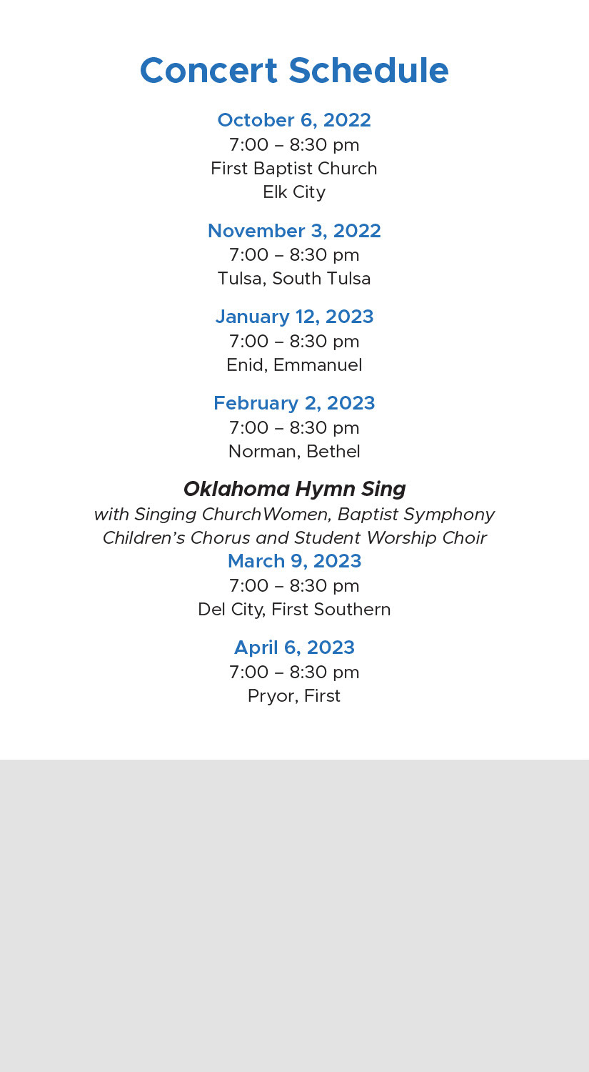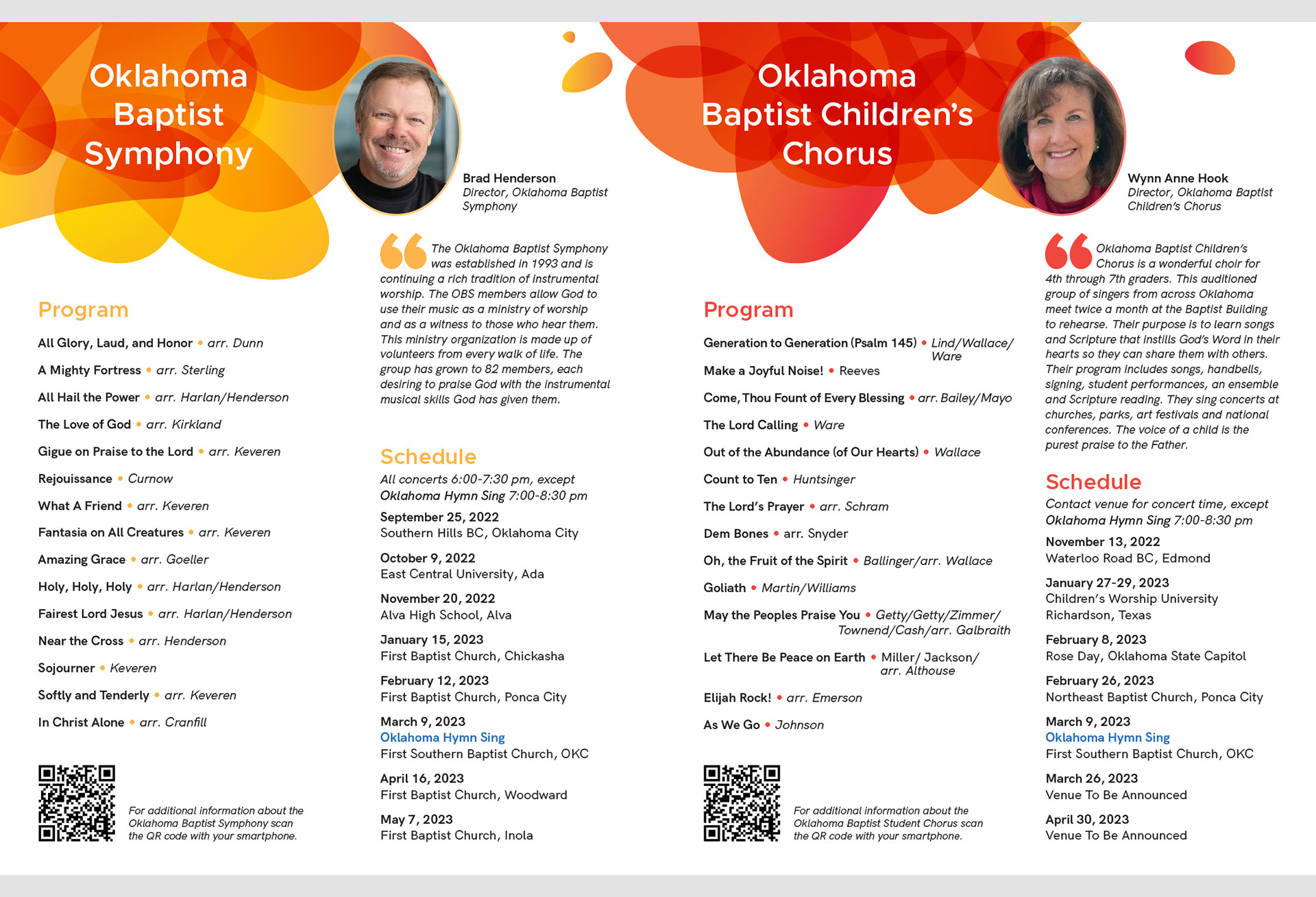 For the 2022-23 concert season, Oklahoma Baptist’s Worship & Music Ministry approached BOYDesign to create press kits to promote five music groups and two special events. A printed program and smartphone programs were created for The Singing Churchmen, Singing ChurchWomen, Oklahoma Baptist Symphony, Oklahoma Baptist Children’s Chorus and Oklahoma Student Worship Choir. Posters, bulletin inserts, social media and multimedia slides were also designed. The press kits included biographical information, photos and videos. Similar materials were designed for the “Oklahoma Baptists Hymn Sing” and “Singing and Praising Sunday Celebration.”